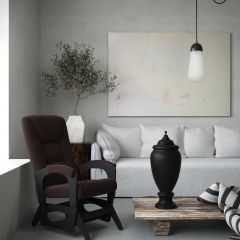 Для комфортного отдыха имеет маятниковый механизм глайдер, который выполняет классическую функцию покачивания, при этом она не проминает напольное покрытие. Кресло обтянуто мебельной тканью или искусственной кожей, каркас-дерево, боковины выполнены в виде криволинейных деталей, образующих ножки-опоры, материал боковины фанера. На боковинах имеются мягкие подлокотники.