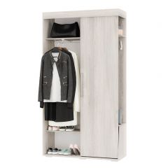 Современная прихожая «Зара», выполненная в спокойном цвете древесной фактуры ясень светлый, может гармонично вписаться в любой интерьер. Несмотря на свою компактность, прихожая имеет просторный шкаф с выдвижной штангой, антресольную полку для головных уборов, две открытых полки для обуви и удобные крючки для верхней одежды.